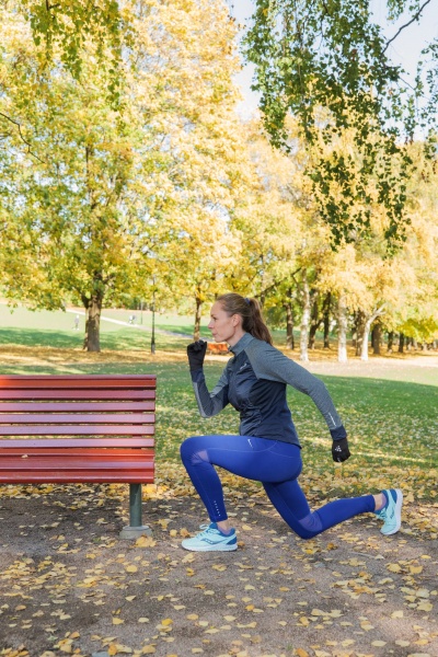 Ta et steg opp på benken og løft det andre kneet. Kom videre rett ned fra benken igjen før du fører det andre benet bak og slipper deg ned i en utfall. Bevar da trykket på hele fremre fotsåle.
