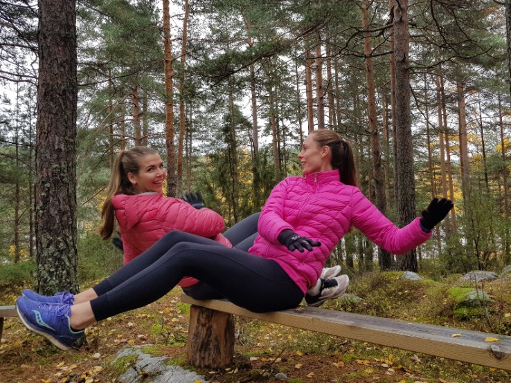 1) Varme opp med å løpe fram og tilbake i nærheten av treningsparken. Løp en retning, gjør 10 rolige og dype knebøy, løp tilbake, gjør 20 mountain climbers. Dette gjentar du fire runder.